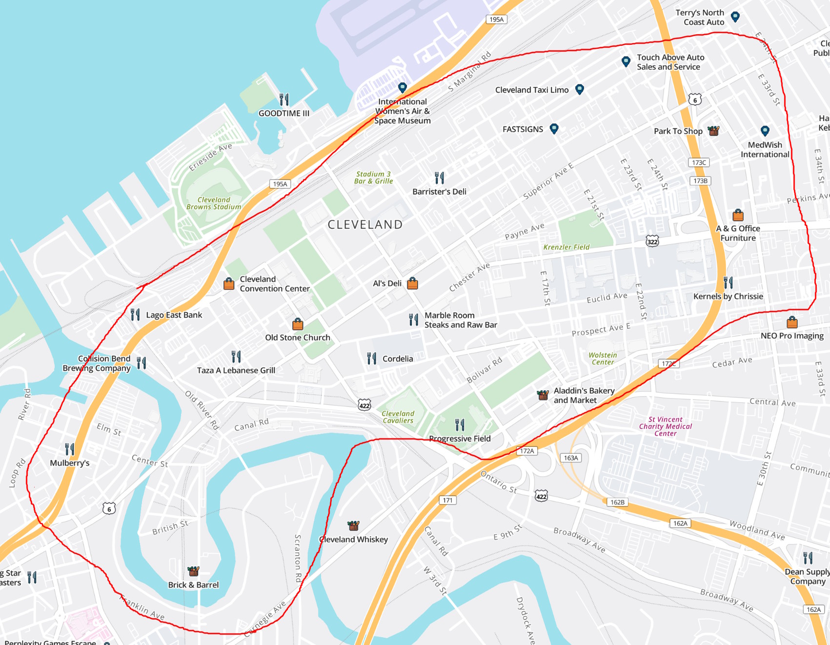 Find the 100 downtown Cleveland doors in this gallery within the red boundary on this map.