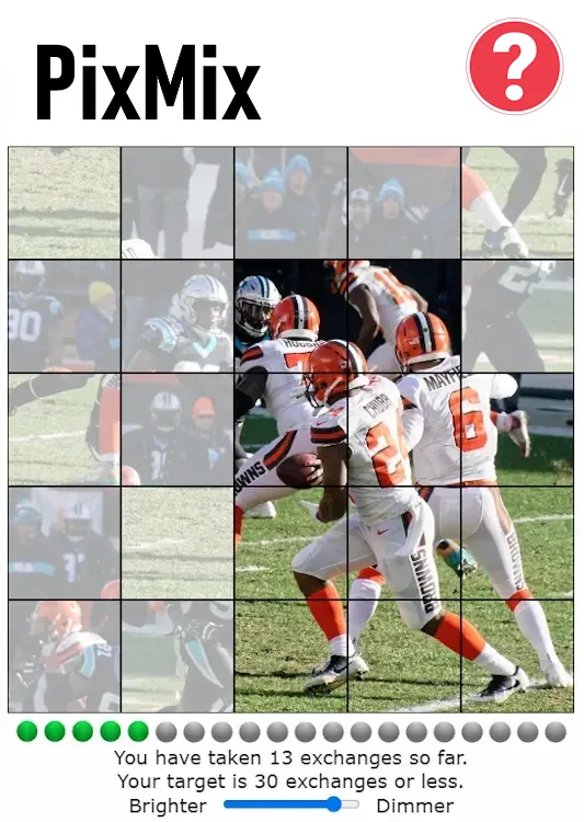 PixMix is descended from the Shuffle word game. If a picture is worth a thousand words, then PixMix qualifies as a word game. The name was inspired by the famous Variety headline, "Sticks Nix Hick Pix". PixMix shows a photo mapped onto a 5x5 grid of tiles that are shuffled. Your task is rearrange the tiles to recreate the original image. Tiles are moved by dragging and dropping them to where you think they belong. Displaced tiles replace moved tiles. A tile in the correct poition is shown at full brightness. Otherwise, it is dimmed. The slider adjusts the level of dimness. You are trying to beat a set target of 30 exchanges.